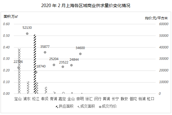 2020年2月,新冠疫情持续影响,复工延时,全市商业市场几乎停摆,2月份商业供应和成交量均低于1万㎡。其中新增供应市场冲击明显,全市范围内仅松江新桥板块1套供应,总体较上月环比下跌79%。与此同时,商业市场需求疲软,环比下降93%。成交均价方面,2月全市成交均价为36622元/㎡,较上月环比上升约34%。虽然商业市场的供求端短期受到压制,但是从中长期来看,商业市场的需求依然存在。