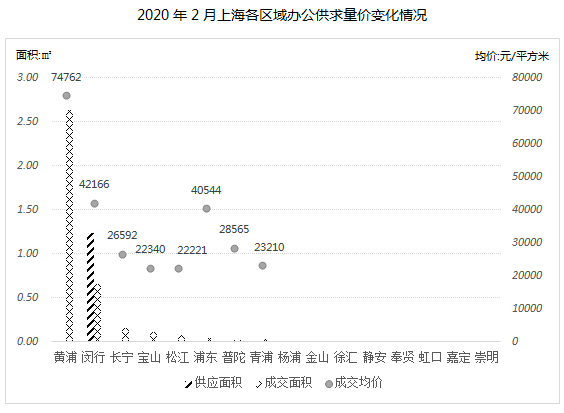 2020年2月,全市办公市场的供应端同样受疫情冲击影响显著,仅闵行区一枝独秀,供应全部来自于七宝万科中心。本月办公成交量较上月环比骤降约66%,其中黄浦区成交最为活跃,成交主要来自于黄浦滨江板块的绿地外滩中心和打浦桥板块的新富港中心。成交均价方面,黄浦区以超7万的均价遥遥领先。受疫情影响,今年办公市场原定新增入市项目预计会有所推迟,办公市场的供求端短期降温,但是从长期来看,办公市场的供求结构变化不会很大,依旧将维持供大于求的局面。